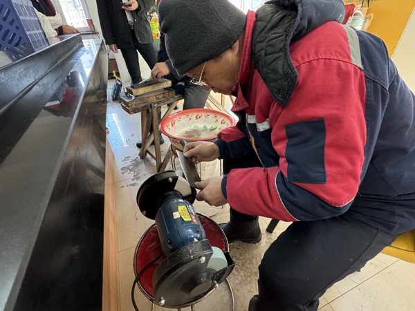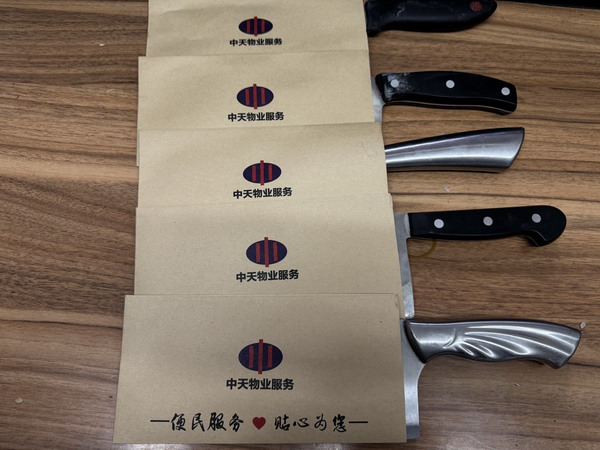 寒冷的天氣也阻擋不住業(yè)主們參加活動的熱情,他們拿出家里的菜刀、砍刀、剔骨刀、剪刀、西餐刀……等各式刀具來到服務中心的便民服務點排隊磨刀。在磨刀等候的閑暇之余業(yè)主們還可以嘮著家常,拉近了彼此之間的距離。物業(yè)工作人員為業(yè)主的每把刀具上貼好樓號房號,做好登記。
