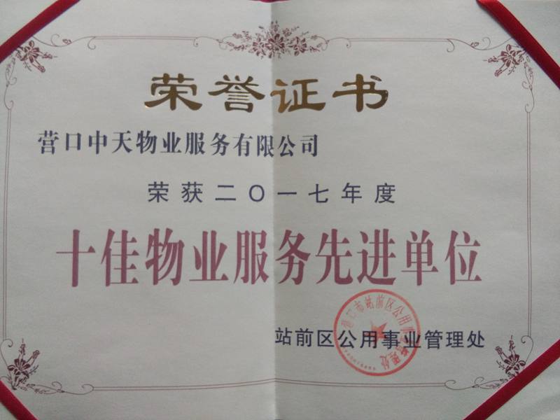 2月6日營口市站前區(qū)公用事業(yè)管理處召開2017年度表獎大會,會上授予中天物業(yè) “2017年度十佳物業(yè)服務(wù)先進(jìn)單位”稱號。
