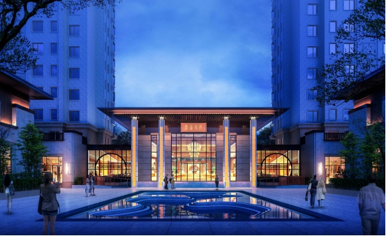 中天·書(shū)香庭院主入口位于青花大街一側(cè),以中式制式大門(mén),彰顯大宅品質(zhì)。入口處,以醇熟商業(yè)街渲染繁華氛圍。大門(mén)兩側(cè)以豐草、樹(shù)陣,隔出莊嚴(yán)禮序的景觀(guān)大道;景觀(guān)大道中間一泓碧波潭水,用自然景致彰顯尊貴,繁華與寧?kù)o瞬息切換。