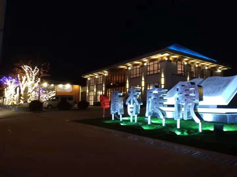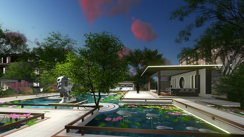 禮儀景觀大道位于園區(qū)景觀主軸線,穿過入戶大堂,首先是“江山影壁”利用框景造園手法,將植株、山石利用景門框成一幅自然山水畫,同時(shí)也起到了很好的分流作用;繞過“江山”至園內(nèi)重點(diǎn)的景觀區(qū)“一池山?!保饘倬W(wǎng)造型山脈與潺潺流水、燈光的完美融合,呈現(xiàn)出一幅立體畫卷;向南沿伸為翰墨閣,用作戶外等候區(qū),也是一個景觀駐足點(diǎn);依次向南分別是利用LED燈和碎石子鋪成水流漣漪狀的“樹影流徑”和造型雕塑“丹青魅影”;最后是書香十六景中的第六景“荷塘漣漪”,位于景觀中心地帶,貫穿南北區(qū),此處荷花塘設(shè)計(jì)為冬夏兩用,即夏日蓄水為荷花塘,冬日抽干水作兒童游樂廣場。中心縱向景觀層次分明,水景豐富,應(yīng)用LED、金屬小品等現(xiàn)代元素并搭配綠植小品,使得四季皆有景可賞。