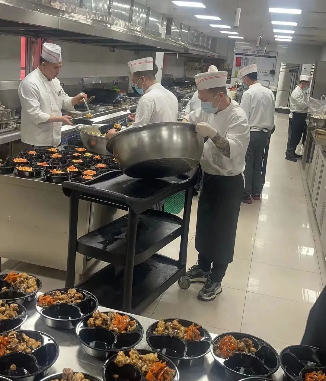 酒店公司面對疫情來臨,迅速準(zhǔn)備了200多個房間,供醫(yī)療團(tuán)隊使用。每天準(zhǔn)備上千份午餐,供給一線的防疫人員食用。廚房人員加班加點,再苦再累沒有人計較得失,保質(zhì)保量,按時將盒飯送到防疫人員手中。