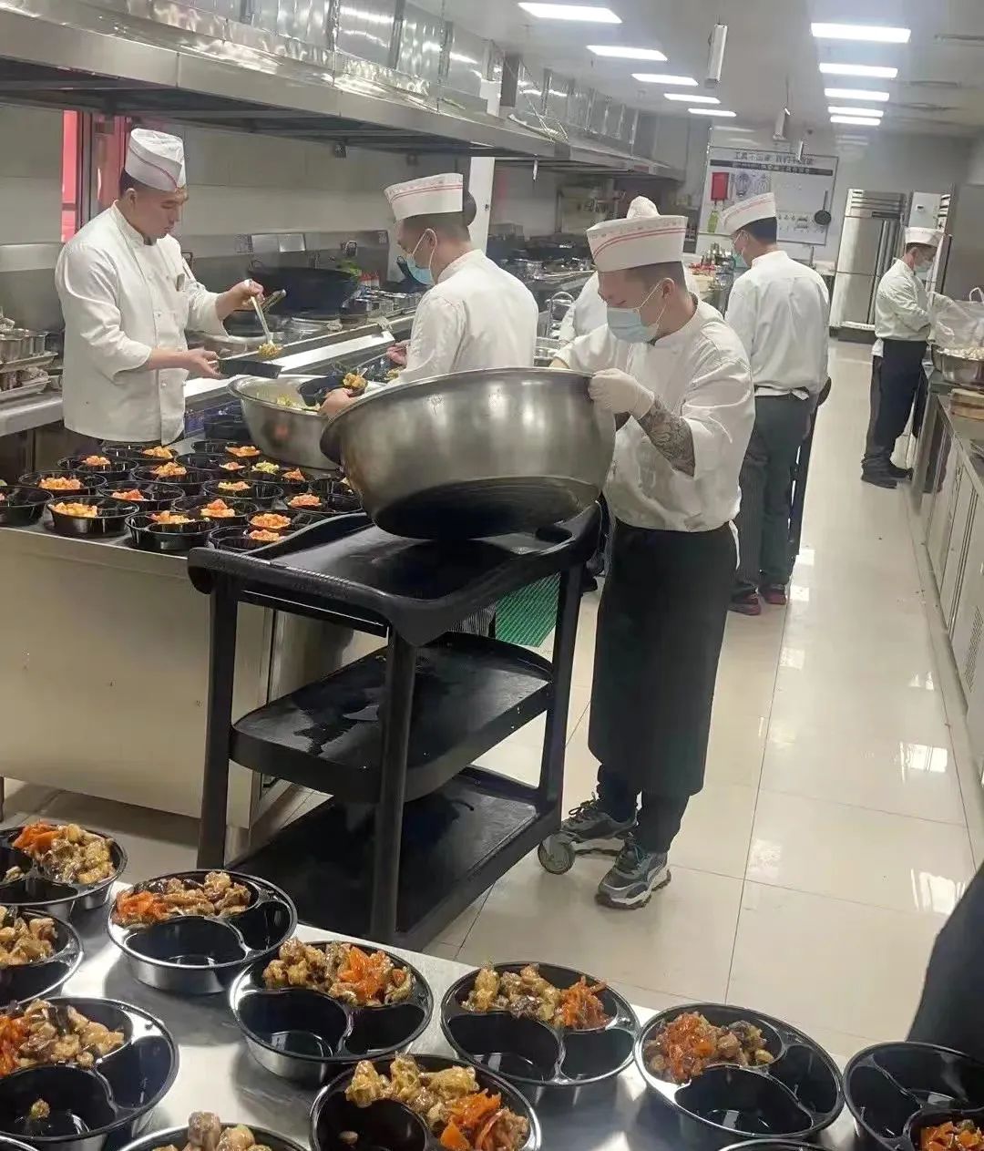 因為疫情需要,中天國際酒店每天為一線抗疫工作人員制作800余份盒飯。食堂精心準備,葷素搭配、營養(yǎng)均衡。面對激增的工作量,酒店公司上下動員,各部門積極配合,每一名員工在酒店備餐區(qū)、客房區(qū)隨時待命,有序地進行配餐分裝、保障工作,他們既是分餐員、又是保潔員、配送員……他們沖鋒在前、不怕苦、不怕累,隨時做好準備充實到酒店緊急、需要人手補充的地方。