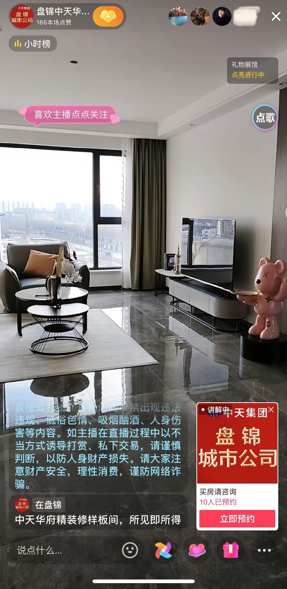 2024年12月,中天集團(tuán)盤(pán)錦城市公司策劃營(yíng)銷團(tuán)隊(duì)以線上直播“云賣(mài)房”的形式開(kāi)辟了新的營(yíng)銷渠道,通過(guò)培育“王牌主播”,利用線上新媒體的高傳播、高擴(kuò)散的優(yōu)勢(shì),宣傳公司在售項(xiàng)目,吸引更多潛在客群關(guān)注,有效轉(zhuǎn)化形成線下的銷售業(yè)績(jī)。