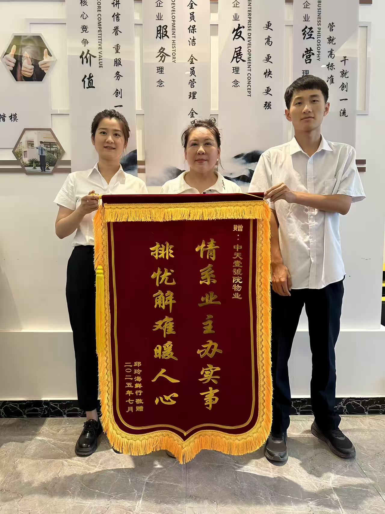 2025年7月12日,壹號(hào)院小區(qū)門市業(yè)主邱女士帶著一面寫有“情系業(yè)主辦實(shí)事 排憂解難暖人心”的錦旗,送到了小區(qū)物業(yè)服務(wù)中心,向物業(yè)工作人員及管家表達(dá)感謝。接下來,就讓我們一起走進(jìn)錦旗背后的故事吧!